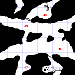 | 46 | Your nostrils are overwhelmed by a sulphurous smell. Fog gathers and swirls on the floor, concealing it. There are food scraps scattered here. | 47 | Encounter: Shrews, Giant (8) Treasure: None. | 48 | There is a pile of dung here. Treasure: 100sp. |