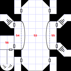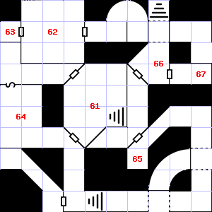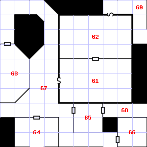 | 52 | This area is covered in cobwebs. | 53 | The air here smells of smoke. There is a corroded chain here. | 54 | This area smells faintly of urine. |