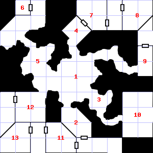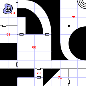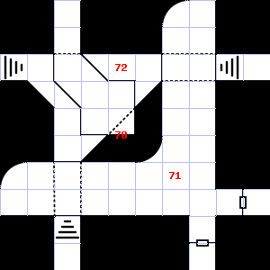 | 70 | A strong, gusting wind blows through this area. There is a pile of ashes here. Treasure: 500sp, 30gp. | 71 | 72 | This area smells faintly of urine. Encounter: Spiders, Crab (1) Treasure: None. | |