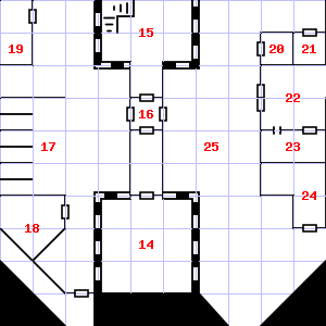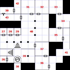 | 25 | The ceiling here is damp. Encounter: Beetles, Fire (6) Treasure: None. | 26 | This area has a stale, fetid smell. It is foggy here, making it difficult to see. There is a cracked flask here. Encounter: Halflings (7) Treasure: As per monster type. | 27 | The air here is very cold. Encounter: Stirges (5) Treasure: None. |