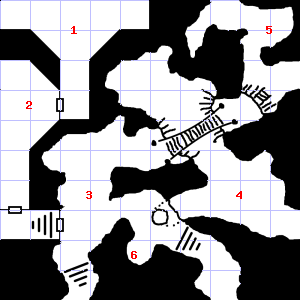 | 4 | A strong, gusting wind blows through this area. An acrid smell assails your nostrils. There are cracks in the ceiling here. | 5 | A slight downdraft blows through this area. There are sticks scattered here. Treasure: 100sp. Trap: Poison needle: Save vs. Poison or die. | 6 | A strong updraft blows through this area. This area has a pleasant, earthy smell. This area is covered in rubble and dirt. |
