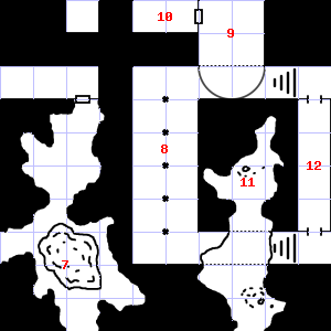 | 10 | 11 | A strong, moaning wind blows through this area. Treasure: 400sp. Trap: Illusion of monsters: Skeletons (7) | 12 | Encounter: Sprites (7) Treasure: As per monster type. | |
