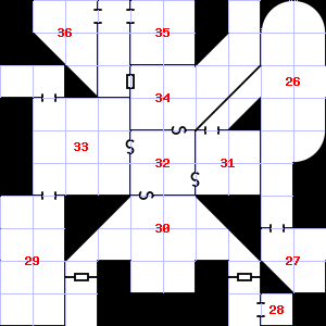 | 25 | A cold air current blows through this area. This area smells faintly of manure. Encounter: Lizards, Gecko (1) Treasure: As per monster type. | 26 | A strong wind blows through this area. A haze of smoke hangs in the air. | 27 | There is a broken arrow here. |