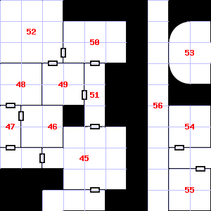 | 46 | There is a pick handle here. Encounter: Shrews, Giant (6) Treasure: As per monster type. | 47 | The air here is very hot. There is a splintered club here. Encounter: Orcs (4) Treasure: As per monster type. | 48 | |