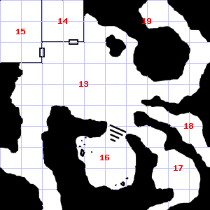 | 13 | A slight, damp breeze blows through this area. Teeth and fangs are scattered here. Treasure: 400sp, 50gp. | 14 | A strong, gusting wind blows through this area. Trap: Fog: Looks like poison gas, but harmless. | 15 | There are bones scattered here. Encounter: Goblins (7) Treasure: As per monster type. |