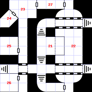 | 22 | Your nostrils are overwhelmed by a sulphurous smell. There are cracks in the ceiling here. | 23 | A haze of smoke hangs in the air. There are cracks in the ceiling here. | 24 | The wall here is damp. Encounter: Goblins (4) Treasure: None. |