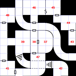 | 40 | This area is very dusty. Encounter: Lizards, Gecko (2) Treasure: None. | 41 | A slight updraft blows through this area. This area has a stale, fetid smell. There is a large puddle of water here. Trap: Fog: Looks like poison gas, but harmless. | 42 | Fog gathers and swirls on the floor, concealing it. This area is covered in rubble and dirt. |