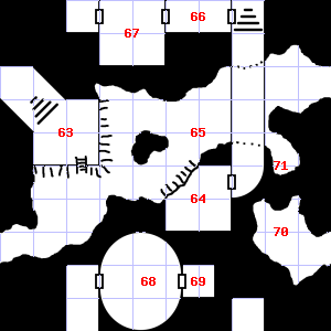 | 67 | A strong, moaning wind blows through this area. Guano covers this area. Encounter: Stirges (8) Treasure: None. | 68 | The air here smells of smoke. Treasure: 300sp. Trap: Illusion of monsters: Dwarves (4) | 69 | A strong wind blows through this area. This area smells faintly of urine. This area is covered in rubble and dirt. Encounter: Lizards, Gecko (3) Treasure: As per monster type. |