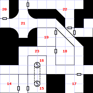 | 16 | This area has a stale, fetid smell. There are rotting wood pieces here. | 17 | Trap: 10' Pit: 1d6 points of damage if you fall in. | 18 | The air here smells of smoke. There is a slimy coating on the floor here. Encounter: Gnomes (5) Treasure: As per monster type. |