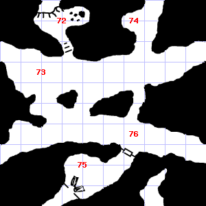| 76 | Encounter: Stirges (7) Treasure: None. | 77 | A gusting breeze blows through this area. This area has a pleasant, earthy smell. There is a bent copper coin lying here. Treasure: 600sp. Trap: Spray: Unknown liquid that attracts Wandering Monsters; double chances for 1d6 hours. | 78 | A slight, damp breeze blows through this area. The ceiling here is damp. |