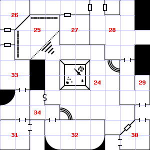 | 28 | 29 | A metallic smell assails your nostrils. Trap: Pendulum blade from ceiling: 1d8 points of damage. | 30 | Treasure: 100sp. | |