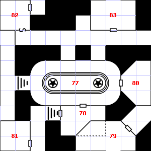 | 79 | The wall here is damp. | 80 | There is a splintered club here. | 81 | A slight, damp breeze blows through this area. Treasure: 500sp, 30gp. |