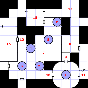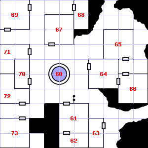 | 64 | 65 | This area is covered in cobwebs. Encounter: Killer Bees (8) Treasure: As per monster type. | 66 | This area has a stale, fetid smell. | |