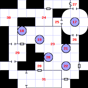 | 25 | A strong, moaning wind blows through this area. There are sticks scattered here. | 26 | 27 | There is a trickle of water here. Treasure: 200sp, 30gp. | |