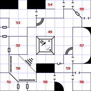 | 64 | This area is covered in cobwebs. | 65 | The air here is very hot. Treasure: 500sp. | 66 | A chlorine-like smell assails your nostrils. This area is covered in cobwebs. Encounter: Skeletons (8) Treasure: None. |