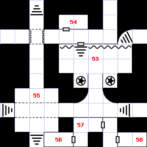 | 55 | A slight updraft blows through this area. Encounter: Dwarves (2) Treasure: As per monster type. | 56 | An acrid smell assails your nostrils. Fog gathers and swirls on the floor, concealing it. Encounter: Snakes, Cobra (1) Treasure: As per monster type. | 57 | Encounter: Sprites (11) Treasure: None. |