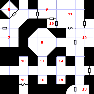 | 19 | A strong, moaning wind blows through this area. Trap: Chute: No damage, but slide to the next level down (ignore if there is no lower level). | 20 | A strong wind blows through this area. The ceiling here is damp. Treasure: 100sp. Trap: Spray: Unknown liquid that attracts Wandering Monsters; double chances for 1d6 hours. | 21 | This area smells faintly of manure. There is a slimy coating on the floor here. |