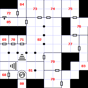 | 67 | There is a mold growing here. Encounter: Lizards, Gecko (2) Treasure: None. | 68 | A strong updraft blows through this area. Fog gathers and swirls on the floor, concealing it. Treasure: 400sp, 50gp. Trap: Flash of light: Save vs. Spells or be blinded for 1d8 turns (1d8x10 minutes). | 69 | A cold air current blows through this area. The wall here is damp. |
