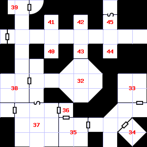 | 34 | There is a slimy coating on the wall here. Trap: Pendulum blade from ceiling: 1d8 points of damage. | 35 | A metallic smell assails your nostrils. Fog gathers and swirls on the floor, concealing it. There are cracks in the ceiling here. Treasure: 100sp, 60gp. | 36 | The air here is very hot. There are cracks in the wall here. Encounter: Green Slimes (3) Treasure: None. |