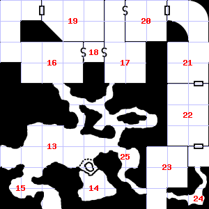 | 16 | A slight breeze blows through this area. This area has a stale, fetid smell. Encounter: Orcs (5) Treasure: None. | 17 | A slight, damp breeze blows through this area. Your nostrils are overwhelmed by a sulphurous smell. | 18 | A slight, damp breeze blows through this area. Encounter: Spiders, Crab (2) Treasure: None. |