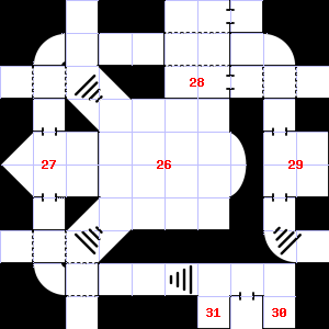| 28 | There is a cracked hammer head here. | 29 | A haze of smoke hangs in the air. There are cracks in the ceiling here. Encounter: Dwarves (3) Treasure: As per monster type. | 30 | Encounter: Spiders, Crab (3) Treasure: None. |