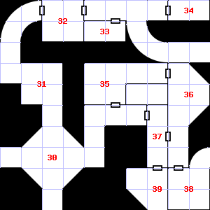 | 31 | A cold air current blows through this area. | 32 | This area has a pleasant, earthy smell. Trap: 10' Pit: 1d6 points of damage if you fall in. | 33 | The air here smells of smoke. A haze of smoke hangs in the air. There is a bent copper coin lying here. Treasure: 300sp, 30gp. |