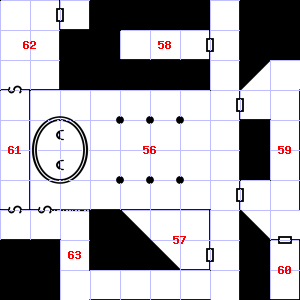 | 55 | 56 | A cold air current blows through this area. Fog gathers and swirls on the floor, concealing it. | 57 | There is a small puddle of water here. Encounter: Killer Bees (2) Treasure: None. | |
