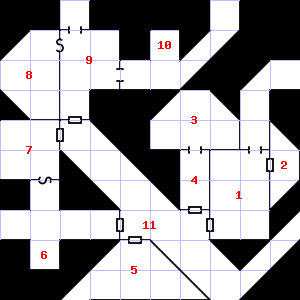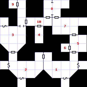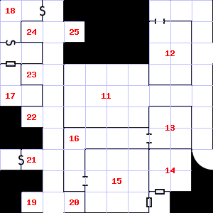 | 16 | This area has a pleasant, earthy smell. There are cracks in the ceiling here. Encounter: Sprites (11) Treasure: As per monster type. | 17 | This area is covered in cobwebs. | 18 | Treasure: 300sp. |
