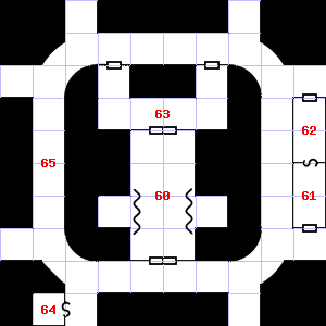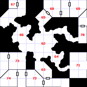 | 61 | Fog gathers and swirls on the floor, concealing it. There is water dripping here. Encounter: Green Slimes (4) Treasure: As per monster type. | 62 | Your nostrils are overwhelmed by a sulphurous smell. There is a broken sword blade here. Encounter: Halflings (14) Treasure: None. | 63 | |