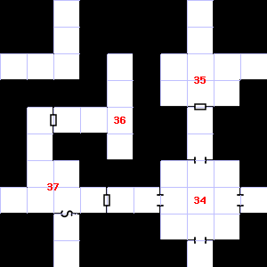 | 34 | A slight, damp breeze blows through this area. This area smells faintly of urine. The wall here is damp. | 35 | 36 | Encounter: Skeletons (10) Treasure: None. | |
