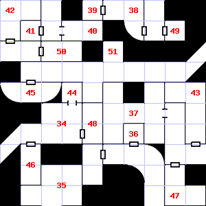 | 49 | Encounter: Acolytes (7) Treasure: None. | 50 | There are rotting wood pieces here. Trap: Chute: No damage, but slide to the next level down (ignore if there is no lower level). | 51 | A strong, gusting wind blows through this area. Fog gathers and swirls on the floor, concealing it. There are cracks in the wall here. |