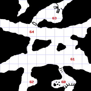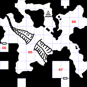 | 64 | Encounter: Orcs (4) Treasure: None. | 65 | This area is covered in rubble and dirt. Treasure: 600sp, 40gp. | 66 | There is water dripping here. |