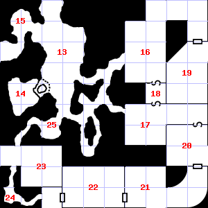 | 19 | There are sticks scattered here. | 20 | There is a trickle of water here. Encounter: Acolytes (7) Treasure: As per monster type. | 21 | A cold air current blows through this area. There is a large puddle of water here. |