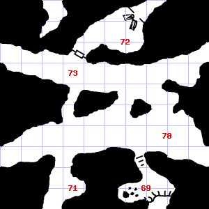 | 70 | A slight updraft blows through this area. | 71 | A haze of smoke hangs in the air. The wall here is damp. | 72 | There are bits of fur and hair scattered around here. |