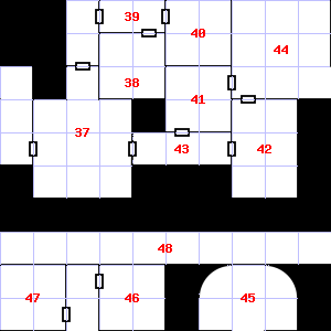 | 37 | 38 | A cold air current blows through this area. This area has a pleasant, earthy smell. There are cracks in the ceiling here. | 39 | This area smells faintly of manure. Encounter: Killer Bees (1) Treasure: As per monster type. | |