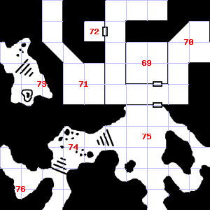 | 70 | 71 | The air here smells of smoke. The wall here is damp. Encounter: Snakes, Cobra (6) Treasure: As per monster type. | 72 | The air here is very cold. It is foggy here, making it difficult to see. The wall here is damp. Encounter: Traders (3) Treasure: As per monster type. | |