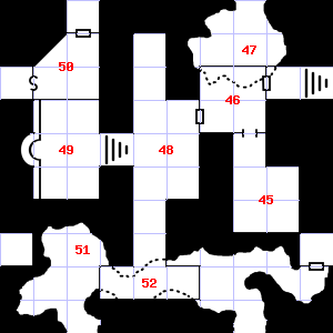| 49 | A slight, damp breeze blows through this area. Trap: Ceiling Block falls: Save vs. turn to Stone or take 1d10 points of damage. | 50 | 51 | A slight, damp breeze blows through this area. This area has a pleasant, earthy smell. Trap: 10' Pit: 1d6 points of damage if you fall in. | |