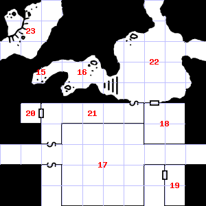 | 19 | There is a trickle of water here. Trap: 10' Pit: 1d6 points of damage if you fall in. | 20 | Fog gathers and swirls on the floor, concealing it. There is a corroded chain here. | 21 | Treasure: 100sp. |