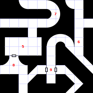 | 7 | There are sticks scattered here. | 8 | A cold air current blows through this area. This area is very dusty. Treasure: 600sp, 60gp, 6 gems. | 9 | There are rotting wood pieces here. |