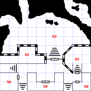 | 58 | 59 | A slight breeze blows through this area. This area is covered in cobwebs. Encounter: Halflings (10) Treasure: As per monster type. | 60 | This area has a stale, fetid smell. There is a cracked flask here. Trap: Fog: Looks like poison gas, but harmless. | |