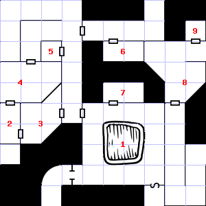 | 4 | 5 | There is water dripping here. | 6 | The air here is very cold. This area smells faintly of manure. This area is very dusty. Treasure: 400sp, 40gp. Trap: Illusion of monsters: Gnomes (4) | |