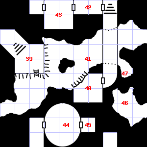 | 43 | Fog gathers and swirls on the floor, concealing it. There is a pile of ashes here. Treasure: 200sp. | 44 | This area is very dusty. | 45 | This area smells faintly of urine. It is foggy here, making it difficult to see. Encounter: Traders (6) Treasure: As per monster type. |