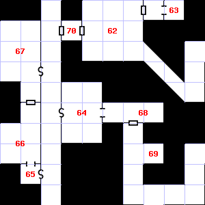| 61 | The air here is very cold. Your nostrils are overwhelmed by a sulphurous smell. Encounter: Halflings (14) Treasure: None. | 62 | A gusting breeze blows through this area. There is a pile of dung here. | 63 | Encounter: Lizards, Gecko (1) Treasure: None. |