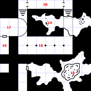 | 16 | A haze of dust hangs in the air. There are dry leaves and twigs scattered here. Encounter: Snakes, Cobra (2) Treasure: As per monster type. | 17 | There is a torch stub here. Encounter: Green Slimes (1) Treasure: As per monster type. | 18 | This area has a pleasant, earthy smell. There are rotting wood pieces here. |