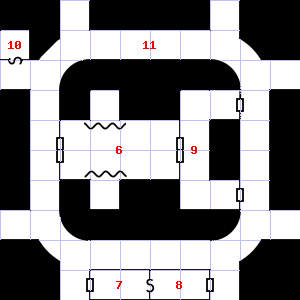 | 13 | The smell of ozone assails your nostrils. | 14 | This area has a pleasant, earthy smell. This area is very dusty. Treasure: 300sp, 10gp. | 15 | The smell of ozone assails your nostrils. A haze of smoke hangs in the air. There is water dripping here. |