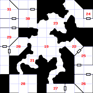 | 22 | A chlorine-like smell assails your nostrils. This area is covered in cobwebs. | 23 | This area is covered in cobwebs. Treasure: 200sp. | 24 | A strong wind blows through this area. This area has a pleasant, earthy smell. It is foggy here, making it difficult to see. |