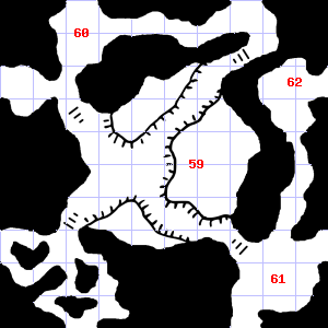 | 58 | Encounter: Skeletons (10) Treasure: None. | 59 | There is water dripping here. Encounter: Goblins (4) Treasure: None. | 60 | The air here is very cold. Treasure: 100sp, 20gp. Trap: Illusion of monsters: Killer Bees (3) |