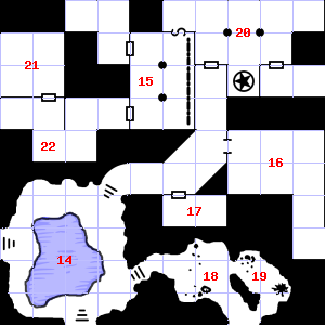 | 13 | There is a mold growing here. | 14 | There is a pile of rags here. Encounter: Killer Bees (8) Treasure: As per monster type. | 15 | Fog gathers and swirls on the floor, concealing it. This area is covered in cobwebs. Encounter: Dwarves (3) Treasure: None. |