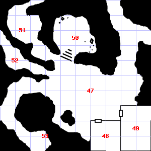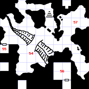 | 55 | A slight, damp breeze blows through this area. There is a broken sword blade here. | 56 | 57 | A gusting breeze blows through this area. Encounter: Skeletons (5) Treasure: None. | |