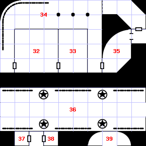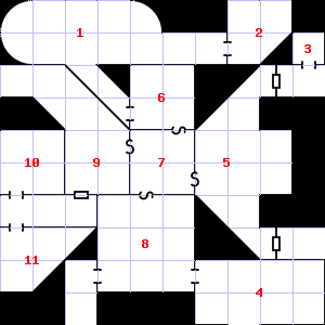 | 28 | There is a slimy coating on the ceiling here. Treasure: 100sp. Trap: Spring-fired darts: 1-6 darts hit for 1-4 points of damage each. | 29 | 30 | A strong wind blows through this area. | |
